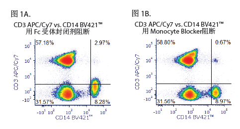 圖1A-B分別為TruStain FcXTM阻斷和True-Stain Monocyte BlockerTM阻斷后的CD14 BV421TM和CD3 APC /Cy7共染結果圖。