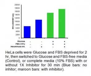 BioVision EZCellTM Glucose Uptake Assay kit 是一種簡單而超級靈敏、易用的葡萄糖攝取檢測試劑盒。試劑盒利用一種特殊的己糖激酶抑制劑抑制己糖激酶,己糖激酶是糖代謝過程中涉及到的第一個酶,在葡萄糖被細胞攝取后,可捕獲葡萄糖。 葡萄糖攝取是利用一系列酶反應(yīng)檢測的,被氧化的葡萄糖產(chǎn)生的中間產(chǎn)物可以與OxiRed?探針反應(yīng)而發(fā)出熒光信號(Ex/Em=535/587 nm) 。熒光信號量直接反應(yīng)細胞所攝取和積累的葡萄糖。不像其他試劑盒是直接檢測葡萄糖衍生物,BioVision 提供了一種直接而強大的葡萄糖研究工具,可用于篩選和表征葡萄糖攝取相關(guān)疾病的藥物。