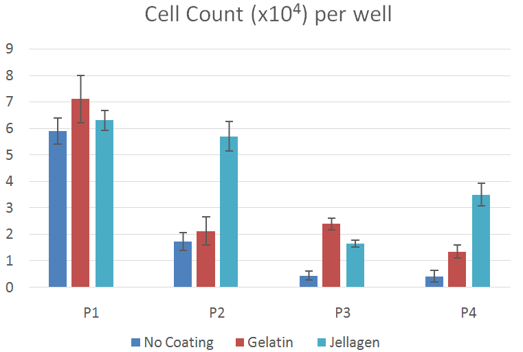 Jellagen膠原蛋白不僅具有良好的細胞兼容性、細胞粘附性,還可以為細胞提供充分的營養。在基質支持軟骨細胞生長過程中,Jellagen膠原上生長的軟骨細胞同在牛明膠上生長的軟骨細胞比較,細胞在P4時存活率更高。