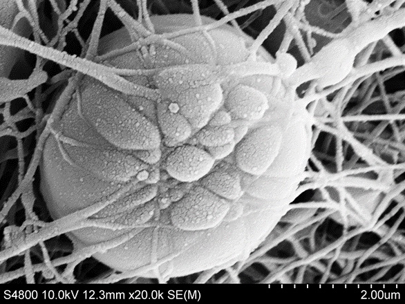 水母膠原蛋白經靜電紡絲技術生產出的納米纖維墊,軟骨細胞嵌入100nm-200nm纖維叢中。該纖維與天然細胞外基質(ECM)相當,表明Jellagen膠原蛋白納米纖維提供了細胞生長理想的環境。