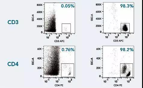 使用Fab-TACS細胞分選重力柱分離全血中的CD3+及CD4+免疫細胞。細胞樣本以CD3-APC (OKT-3)或 CD4-PE (OKT-4) 抗體染色后,進行流式分析,左右分別為分選前后的細胞群分布。死細胞以DAPI染色先行排除,并使用不同FSC/SSC信號來排除雙粘體和細胞碎片。結果顯示:即使直接處理全血,Fab-TACS科技仍能分離出高純度目標細胞。
