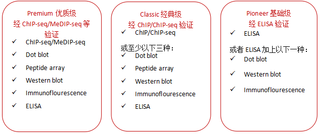 自2004年以來,Diagenode就與領先的表觀遺傳學專家和表觀遺傳學聯盟合作生產、驗證包括抗體在內的表觀遺傳學試劑。2012年,Diagenode用一種創新、嚴謹的抗體分類系統改革了免疫沉淀技術,用于表觀遺傳學研究。根據驗證水平將抗體分為三個不同級別,以幫助您建立選擇抗體的信心。最終,用您信任的抗體獲得滿意的結果。