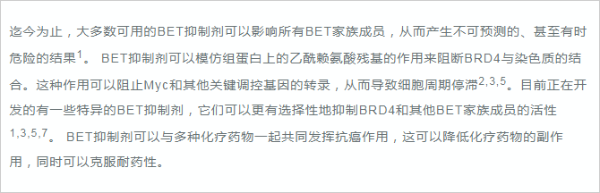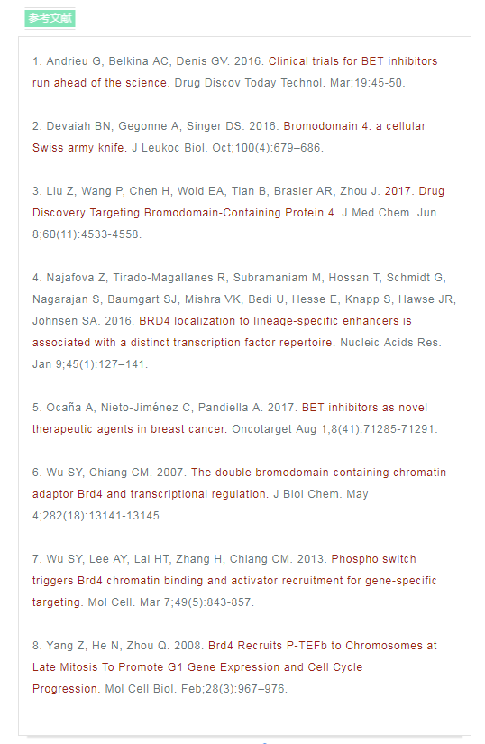 BRD4(溴結(jié)構(gòu)域蛋白4)是一種轉(zhuǎn)錄調(diào)節(jié)因子。研究發(fā)現(xiàn),BRD4在癌癥、自身免疫和炎癥性疾病中具有重要的作用1,2。 正常生理情況下,BRD4主要參與細(xì)胞周期過(guò)程中的基因表達(dá)調(diào)控,其可以與乙酰化染色質(zhì)結(jié)合,保持各種基因在細(xì)胞分裂循環(huán)過(guò)程中的穩(wěn)定表達(dá) ,這種現(xiàn)象被稱為表觀遺傳記憶或基因轉(zhuǎn)錄的“書(shū)簽”2,7。 同時(shí),BRD4在調(diào)控分化和發(fā)育中也起著關(guān)鍵作用2,4。 如果BRD4缺失,骨髓干細(xì)胞將不能分化成為B和T細(xì)胞2。 BRD4亦是MEFs或B細(xì)胞重編程為誘導(dǎo)多能干細(xì)胞過(guò)程中重新表達(dá)干細(xì)胞基因所必需的,在成骨細(xì)胞分化過(guò)程中BRD4也發(fā)揮重要作用。 綜上,BRD4在細(xì)胞周期調(diào)控和分化中的重要作用使其成為癌癥和免疫系統(tǒng)疾病的新興治療靶點(diǎn)。