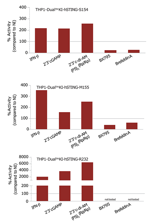 功能獲得(Gain-of-function)的活化-THP1-Dual? KI-hSTING-S154細胞和THP1-Dual? KI-hSTING-M155細胞均均可以持續活化ISG,而THP-1-Dual? KI-hSTING-R232卻不能。加入IFN-β或STING激動劑將進一步促進ISG的活化。注意,結果已被非刺激細胞背景信號標準化。因為其持續活化STING的特性,SAVI細胞的背景非常高,誘導ISG應答的增加倍數低于R232對照細胞。