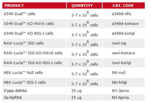 InvivoGen提供一系基于人源肺癌細胞株A549,小鼠巨噬細胞RAW和人源胚腎細胞HEK293穩轉細胞系,助力RNA感受器RIG-I信號通路的研究。這些細胞系包括RIG-I或MAVS基因的敲除細胞株(衍生自A549或RAW細胞系)或者RIG-I基因的過表達細胞株(衍生自HEK-293細胞系)。