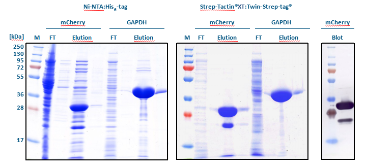 以SDS-PAGE分析發(fā)現(xiàn),不管是mCherry或是GAPDH,使用Strep-tactin? XT: Twin-Strep-tag?都能得到純度較高的目標(biāo)蛋白(見Elution)。Western Blot分析結(jié)果顯示,提取mCherry所出現(xiàn)的雜質(zhì)為其降解產(chǎn)物。