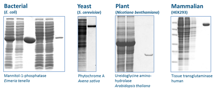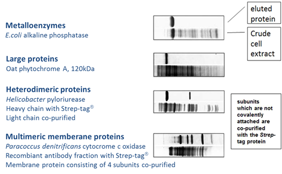 因His-tag系統(tǒng)使用Ni離子,所以在純化金屬蛋白(多數(shù)為酶)時,可能會受到金屬間交互作用的干擾。而使用Strep-tag? 則不會出現(xiàn)此問題,因?yàn)镾trep-Tactin? XT與Strep-tag?的特異性結(jié)合不受金屬離子影響。且因其溫和的純化流程,所以還能用于純化大型蛋白、多亞基的蛋白復(fù)合體或是跨膜蛋白,并且保持蛋白功能。以Strep-tag?系統(tǒng)純化出不同的蛋白實(shí)例如下: