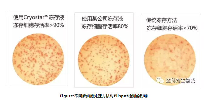 在 ELISPOT 檢測的應(yīng)用中,往往需要用到凍存的淋巴細(xì)胞樣品作為檢測細(xì)胞。由于 ELISPOT檢測的是細(xì)胞的免疫功能,不僅僅需要保持細(xì)胞的存活率,而且還要保證細(xì)胞的功能不發(fā)生變化。傳統(tǒng)的細(xì)胞凍存方法通常是為了保存細(xì)胞株,對細(xì)胞存活率的要求不高,更沒考慮保持細(xì)胞原有的免疫狀態(tài),所以傳統(tǒng)的細(xì)胞凍存方法已經(jīng)不能滿足 ELISPOT 檢測的要求。