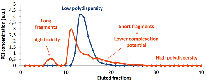 由于長片段的PEI對細(xì)胞有毒性,而短片段PEI結(jié)合DNA能力較差(見紅色),所以優(yōu)化PEI的片段大小,降低其分散性能減少細(xì)胞毒性,同時(shí)增加結(jié)合DNA的能力(見藍(lán)色)和轉(zhuǎn)染重復(fù)性。