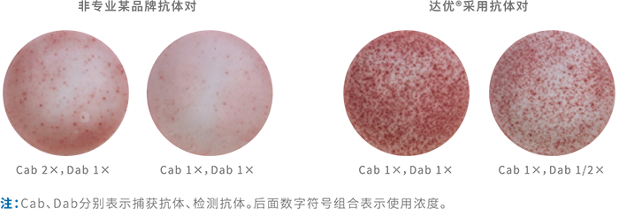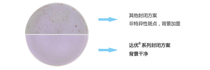 不同的檢測樣本在板孔培養(yǎng)過程中,受各種實驗條件影響,如果封閉不當(dāng)都可能產(chǎn)生非特異性顯色,導(dǎo)致非特異性斑點的產(chǎn)生或者背景顏色的加重。這將直接影響到最后結(jié)果的判斷分析。達優(yōu)?系列產(chǎn)品通過大量實驗,對不同來源、不同配方封閉方法進行封閉效果的對比試驗,篩選出更高效的封閉系統(tǒng),并將之運用到系列試劑盒產(chǎn)品中。