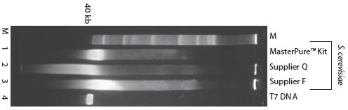 1%瓊脂糖膠電泳分析不同試劑盒提取純化啤酒酵母的500ng DNA,使用EB進行染色。用MasterPure? Kit分離的DNA的大小絕大多數在40-50 kb范圍內。用其它試劑盒提取的DNA會降解成更小的片段。