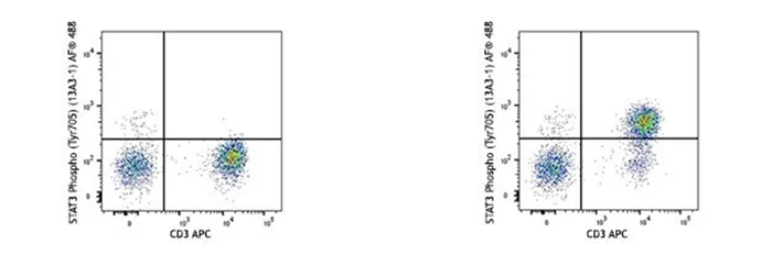 在蛋白翻譯后修飾(磷酸化、乙?;?、甲基化等)的研究過程中,固定劑不僅可以有效的“固定”住翻譯后修飾的位點(絲氨酸、蘇氨酸、酪氨酸等),也可以防止目標位點在活細胞中很快降解(比如磷酸酶會去除磷酸化修飾、去甲基化酶會移除甲基化修飾等)。下面的例子是用IL-6的重組蛋白刺激人外周血15分鐘后看STAT3第705位酪氨酸的磷酸化水平,在刺激完樣本后就需要通過固定來實現目的氨基酸磷酸化水平“停留”在IL-6刺激15分鐘這個節點上。