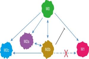 不同類型巨噬細胞的表型轉換。M0型巨噬細胞可以在不同誘導劑的作用下極化為M1或M2(M2a、M2b、M2c)。M2b型巨噬細胞可以在不同刺激下轉換為M2型巨噬細胞的其他亞型。值得注意的是,M2b型巨噬細胞抑制從M0到M1的轉換。此外,在M1刺激劑的條件下,M2b型巨噬細胞不能重新極化為M1型。