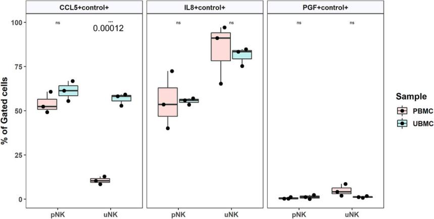與外周血白細胞相比,胎盤床樣品中的CD16-CD56++NK細胞明顯表達更高CCL5 mRNA4。另一方面,胎盤床和外周血中CD16+CD56++細胞表達的RANTES mRNA水平相似。此外,在胎盤床和外周血樣本中,兩種NK細胞中IL8PGF mRNA水平均無差異。