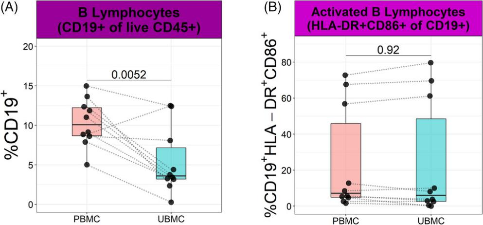 外周血B細胞CD45+CD3-CD19+占總活CD45+白細胞比例高于胎盤床樣品分別為10.34 ± 0.94%5.36 ± 1.33%)(6A。為了研究B細胞的活化狀態,本文還檢測CD86和人類白細胞抗原HLAII類分子HLA-DR的表達。外周血和胎盤床樣品中表達這兩種受體的B細胞比例相似6B