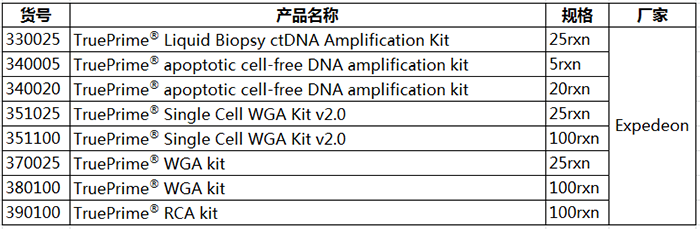擴增能力強,無引物互作,無擴增偏倚,覆蓋率高,保真性好,重復性好,集諸多優勢于一身的TruePrime?,還有什么理由不選擇呢?TruePrime?會為您的單細胞測序工作帶來極大的便利!除此之外,Expedeon還提供用于擴增cfDNA, circular DNA等多種類型DNA的試劑盒喲!
