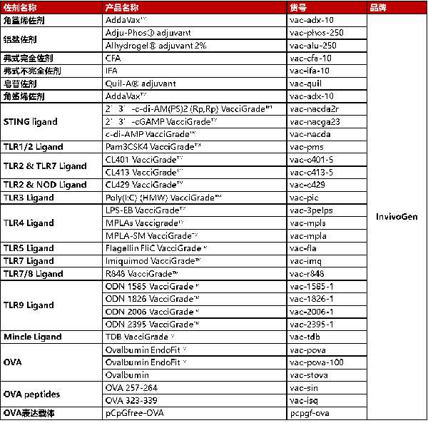 當(dāng)前,針對COVID-19的疫苗研發(fā)以前所未有的速度在世界范圍內(nèi)陸續(xù)開展,世界各地的科學(xué)家正在探索開發(fā)針對SARS-CoV-2的有效疫苗的所有潛在策略。大多數(shù)用于COVID-19的候選疫苗旨在誘導(dǎo)針對病毒S蛋白的中和抗體,防止病毒通過人ACE2受體攝取從而阻止感染。COVID-19疫苗開發(fā)前景的顯著特征是正在評估的技術(shù)平臺的多樣性,包括:減毒活疫苗,基于病毒載體的疫苗,基于重組蛋白的疫苗,DNA疫苗和RNA疫苗。其中重組蛋白疫苗通常使用SARS-CoV-2蛋白(例如S蛋白)在宿主中引起免疫反應(yīng)。通常與佐劑結(jié)合使用以提高免疫原性。迄今為止,已進(jìn)入臨床試驗的COVID-19候選疫苗包括Moderna開發(fā)的mRNA疫苗(NCT04283461)和康希諾 (NCT04341389)開發(fā)的重組腺病毒疫苗。此外,諸如AS03和MF59等佐劑正在重組蛋白疫苗中進(jìn)行探索,使用佐劑可增強(qiáng)免疫原性并降低劑量,使更多人接種疫苗成為可能。天然免疫專家InvivoGen提供科研用途的佐劑和OVA產(chǎn)品供研究人員選擇。