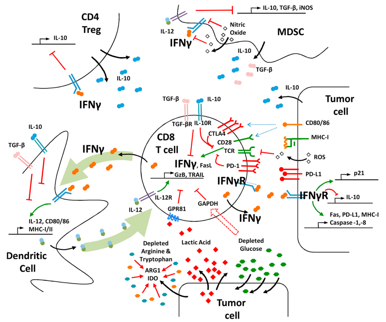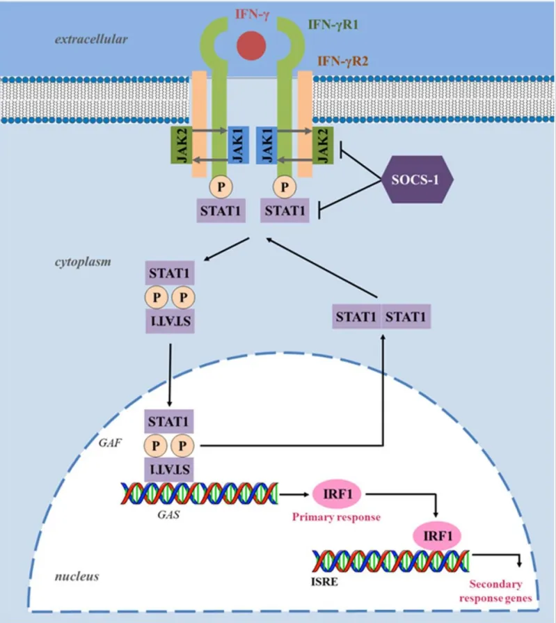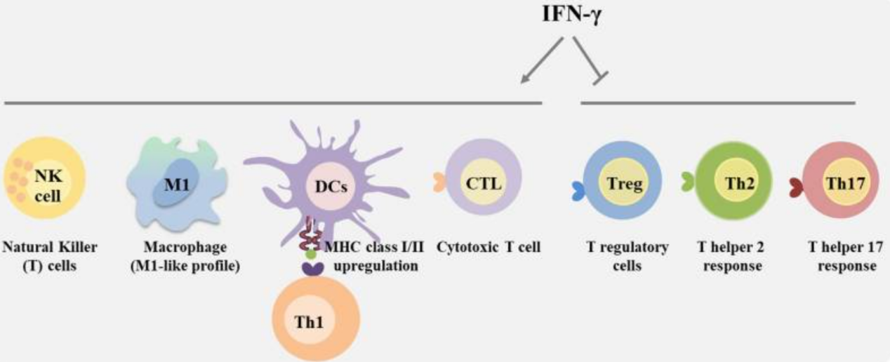 IFN-γ信號通路協(xié)調(diào)多種生物反應(yīng),在先天和適應(yīng)性免疫中扮演的重要角色。IFN-γ可以通過促進(jìn)Th1細(xì)胞、CD8+T淋巴細(xì)胞、NK細(xì)胞、樹突狀細(xì)胞及巨噬細(xì)胞的活性,抑制Treg、Th2和Th17細(xì)胞分化和功能,發(fā)揮免疫調(diào)節(jié)作用。此外,IFN-γ可激活巨噬細(xì)胞,使其分化為M1型巨噬細(xì)胞。